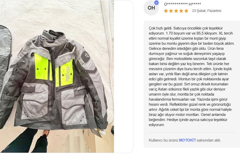 Çok hızlı geldi. Satıcıya öncelikle çok teşekkür ediyorum. 1.70 boyum var ve 85,5 kiloyum. XL tercih ettim normal kıyafet üzerine kışları bir mont giyip üzerine bu montu giyerim diye bir beden büyük aldım. Gelince denedim istediğim gibi oldu. Ürün fena durmuyor yağmur ve soğuk deneyimini yaşayıp göreceğiz. Ben motosiklete sezonluk taşıt olarak bakan birisi değilim yaz kış binerim. Tek ürünle her mevsimi çözerim diye bunu tercih ettim. İçinde kışlık astarı var, yırtık filan değil ama dikişleri çok tatmin edici gibi gelmedi. Montun bir çok noktasında ayar gergileri var bu güzel. Sırt omuz dirsek korumaları var.iç Astarı sökünce fileli yazlık gibi olur deniyor umarım öyle olur, montta bir çok noktada havalandırma fermuarları var. Yazında işimi görür hissini verdi. Reflektörler güzel renk ve görünürlüğü artırır. Ağırlık ceket tipi bir monta göre normal haliyle biraz ağır oluyor motor montları. Genel anlamda beğendim. Hediye içinde ayrıca satıcıya teşekkür ediyorum.